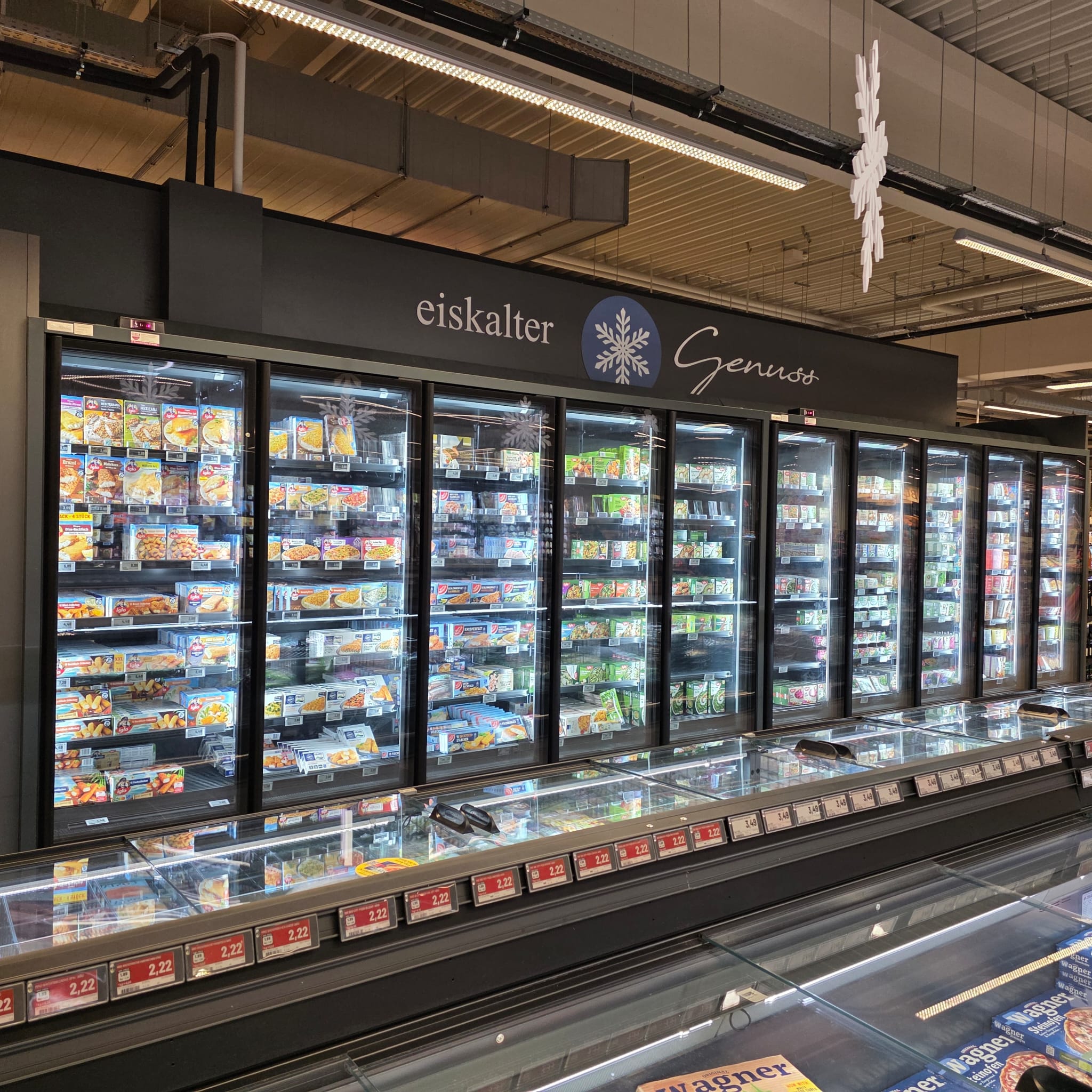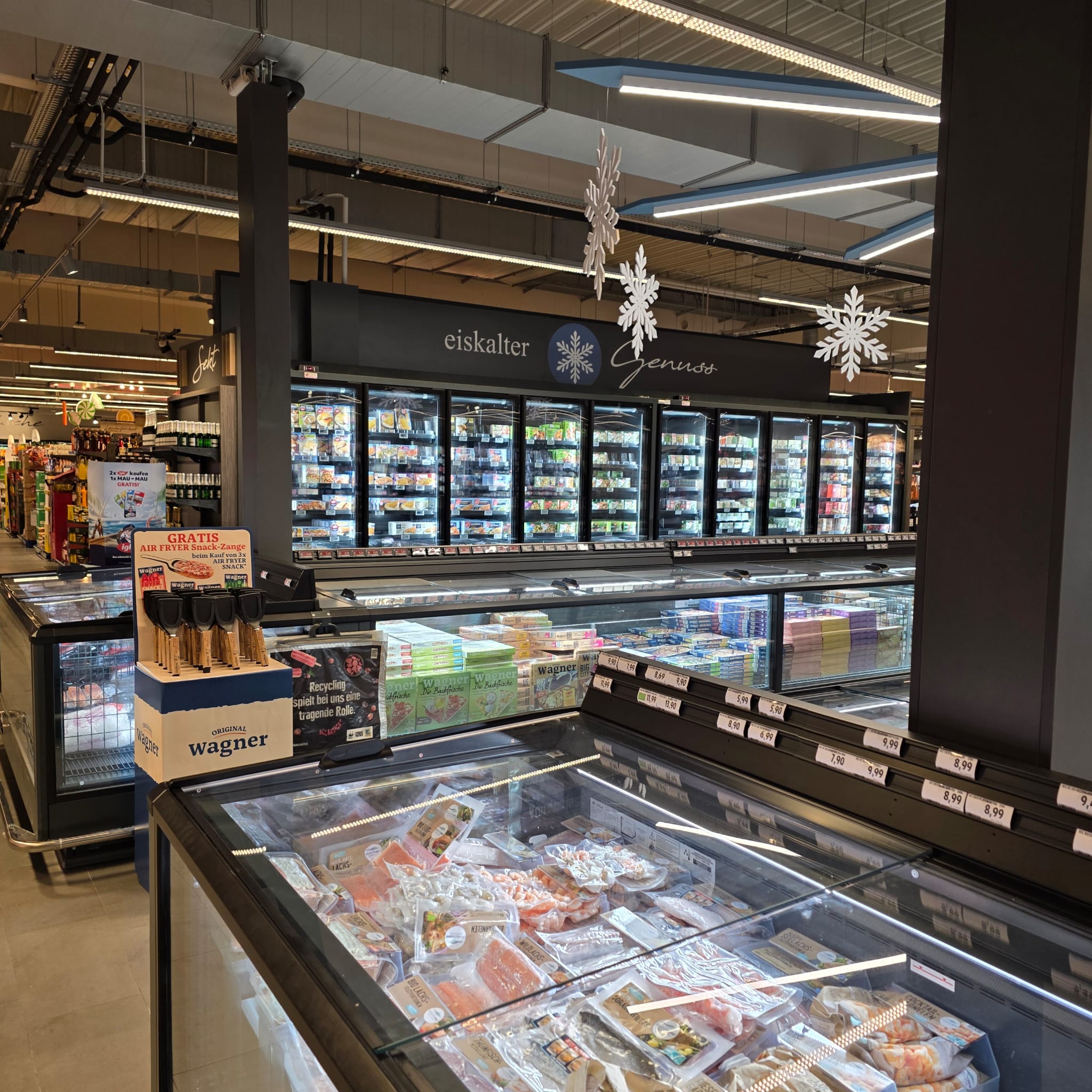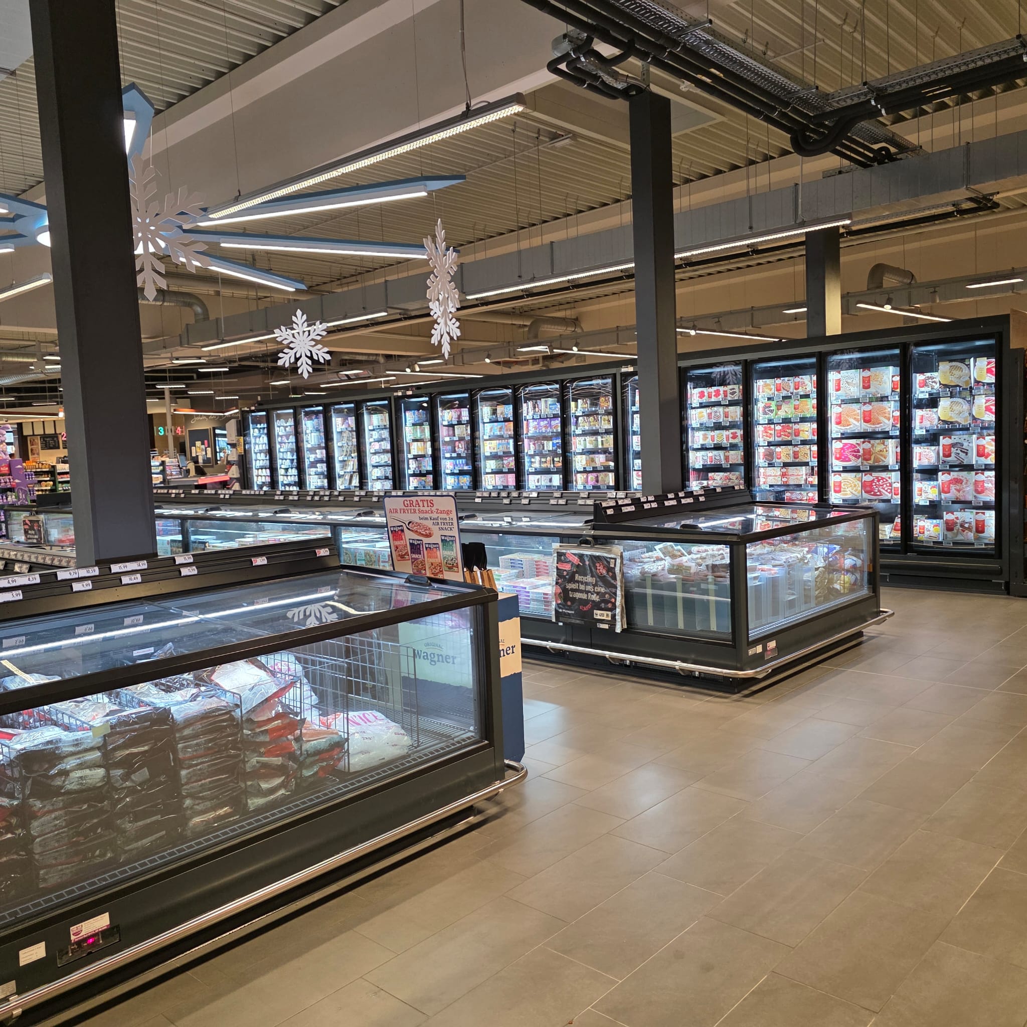Auch bei diesem Projekt wurde nach den neuesten ökonomischen und ökologischen Gesichtspunkten der Markt konzipiert und gebaut, so dass z.B. als Kälteträger das natürliche und umweltschonende CO2 eingesetzt wurde, die Wandkühlregale und Tiefkühlinseln, mit Glastüren oder Schiebescheiben versehen und alle Kühlmöbel wurden mit LED-Beleuchtung ausgestattet